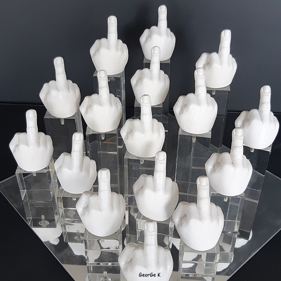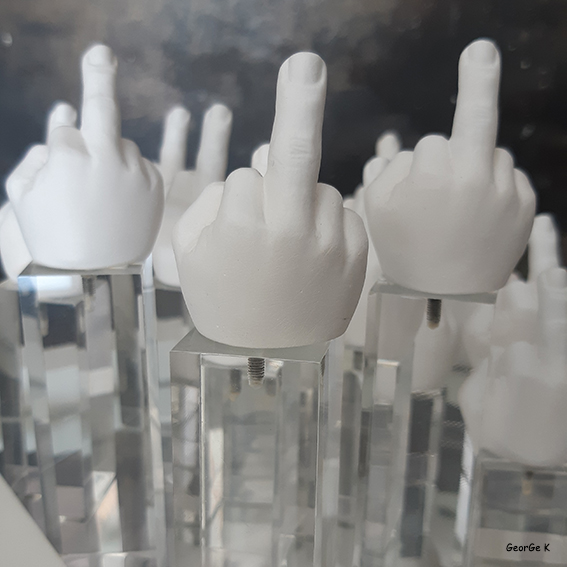 George-K met le doigt d’honneur à l’honneur. Ainsi, ce doigt impudique des romains, ce geste provocateur de l’archer anglais est devenu le geste culte du sculpteur.