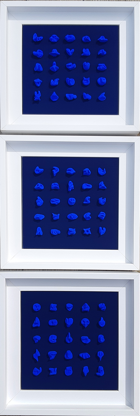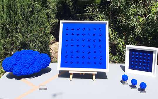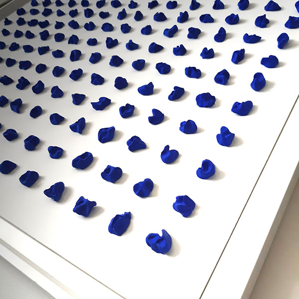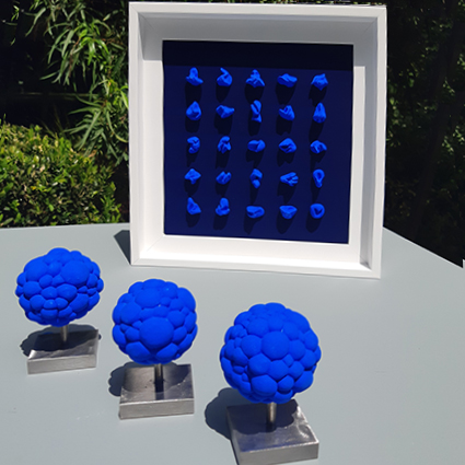 où la ronde-bosse donne le sentiment que la terre cuite associée à son pigment Bleu Velours Outremer laisse l’impression d’une matière douce et enveloppante, moelleuse et protectrice. (Florence Liger d’Avignon)