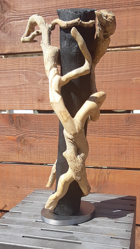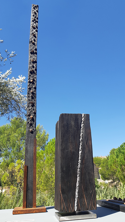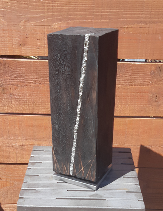 Et dans ce bois brûlé, George-K coule des filets d’eau symboliques de métal en fusion pour rendre au bois sa rivière originelle, dessinant ainsi dans ses veines une nouvelle perspective : faire advenir la nature elle-même. (Florence Liger d’Avignon)
