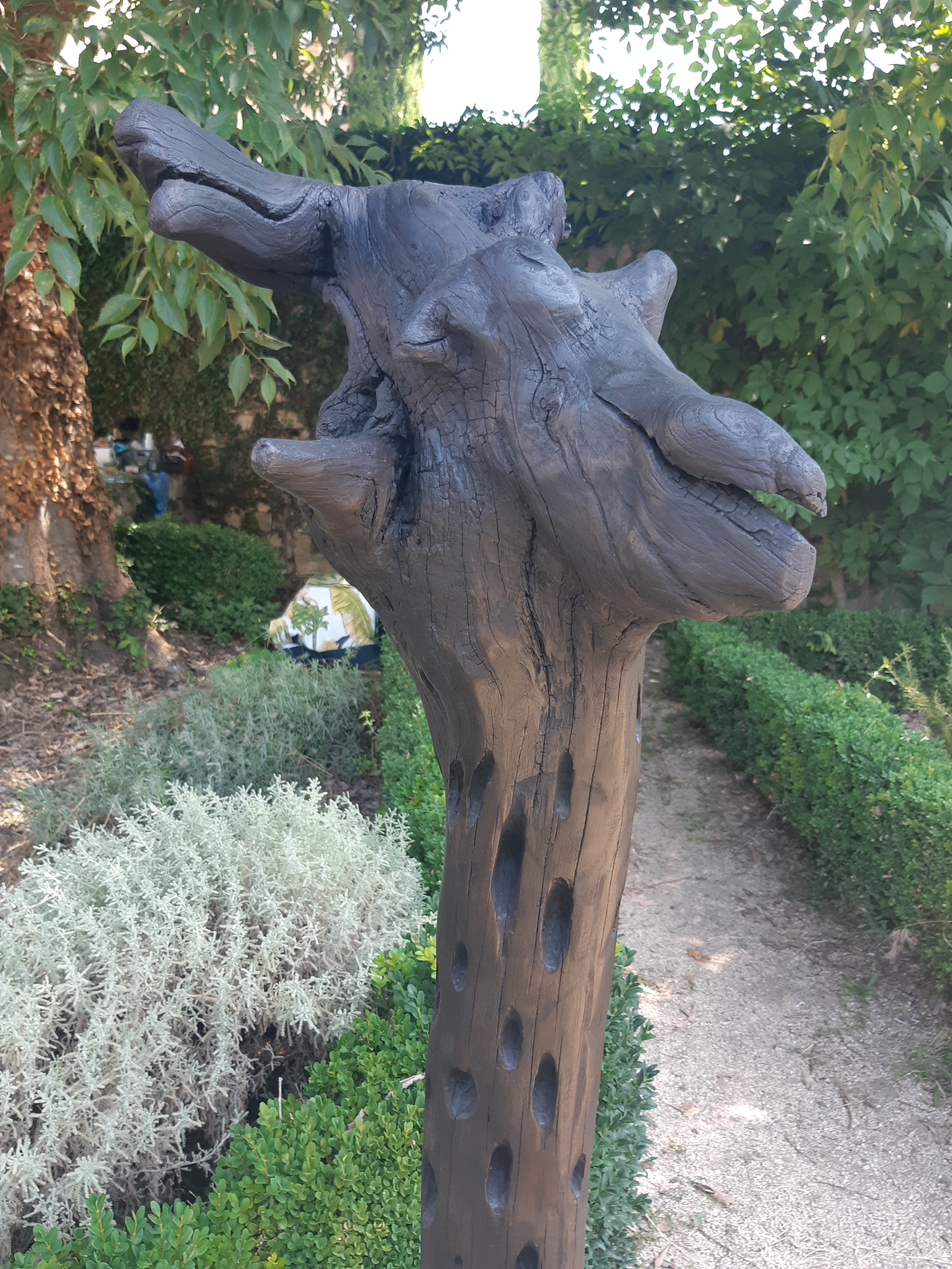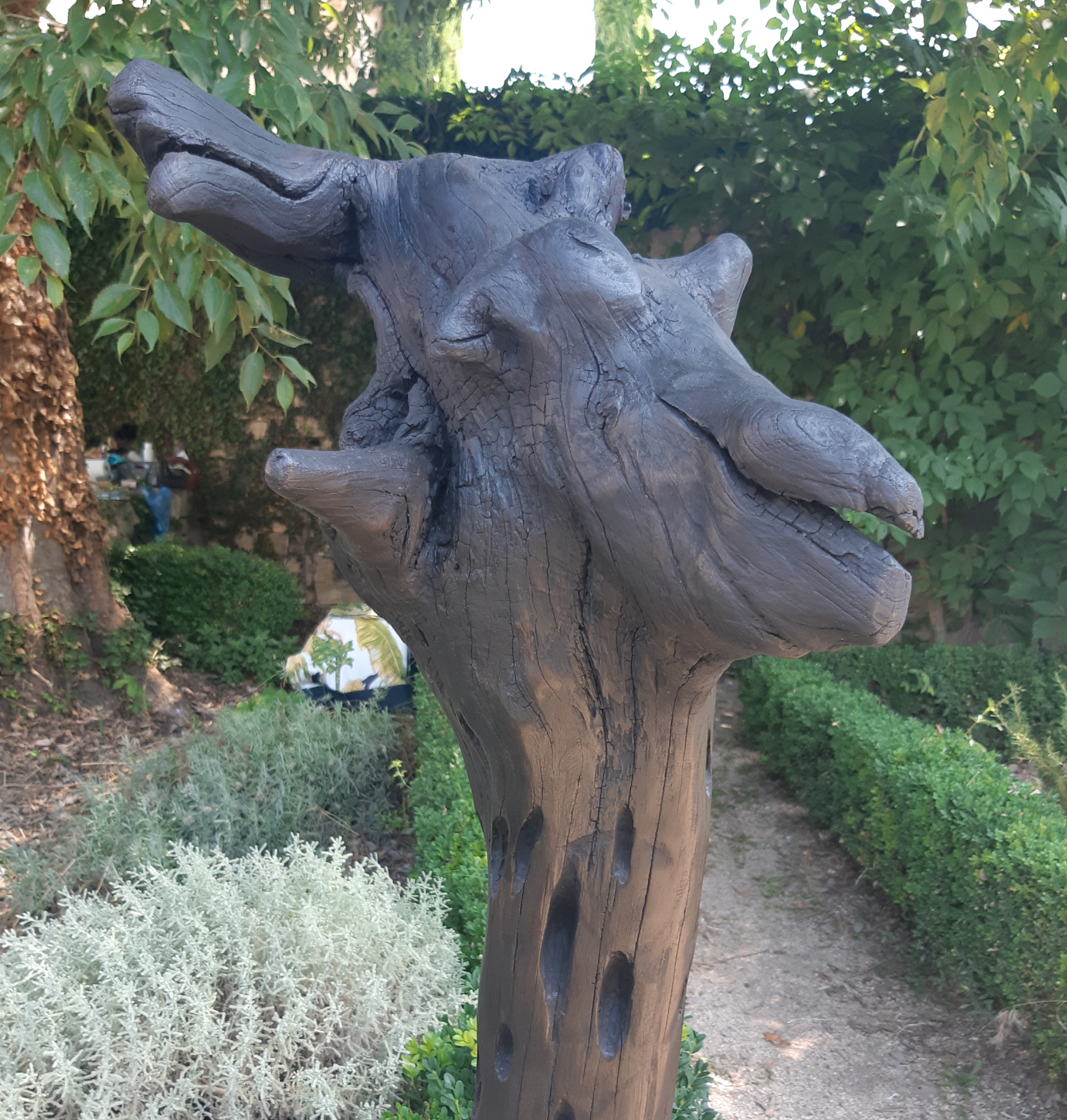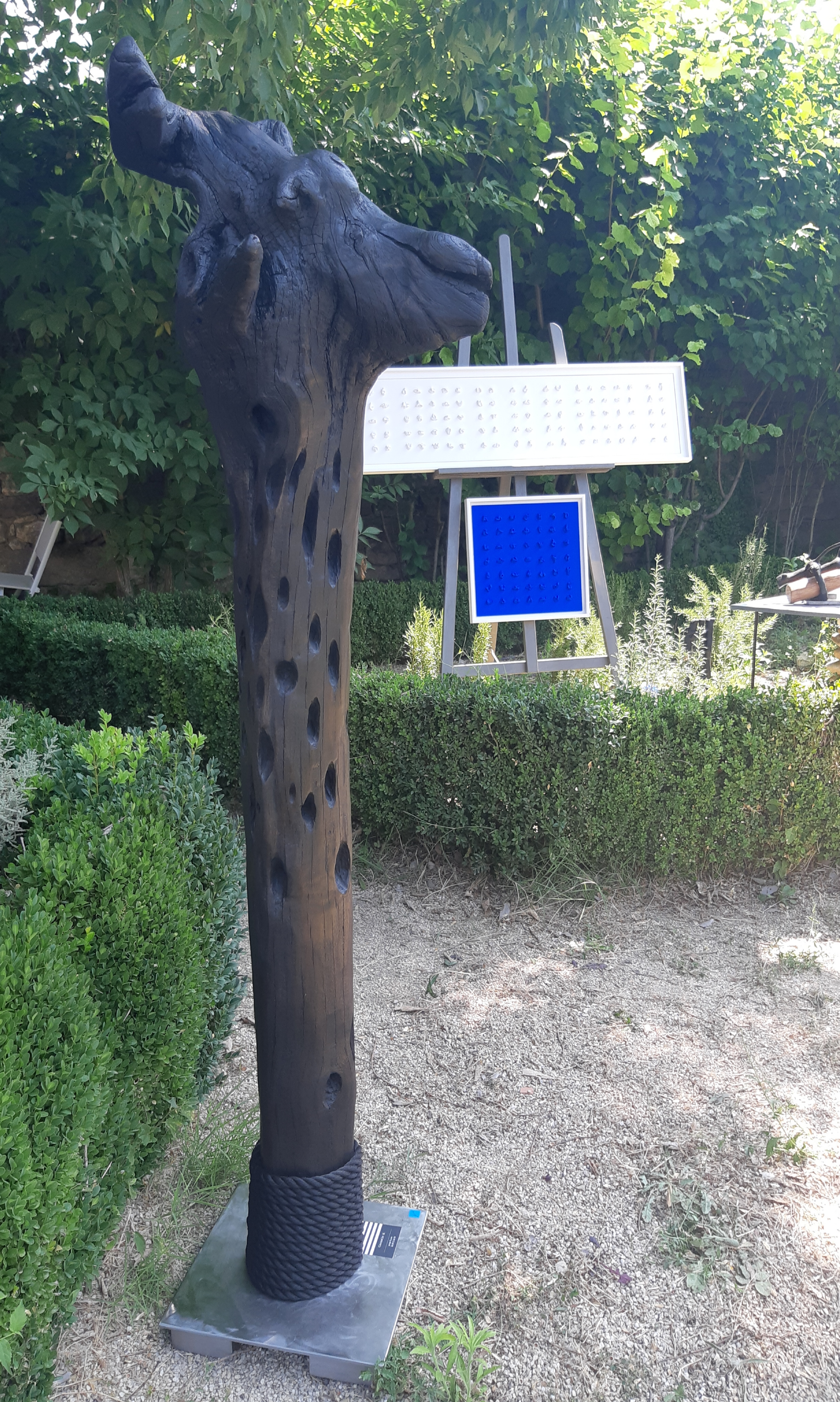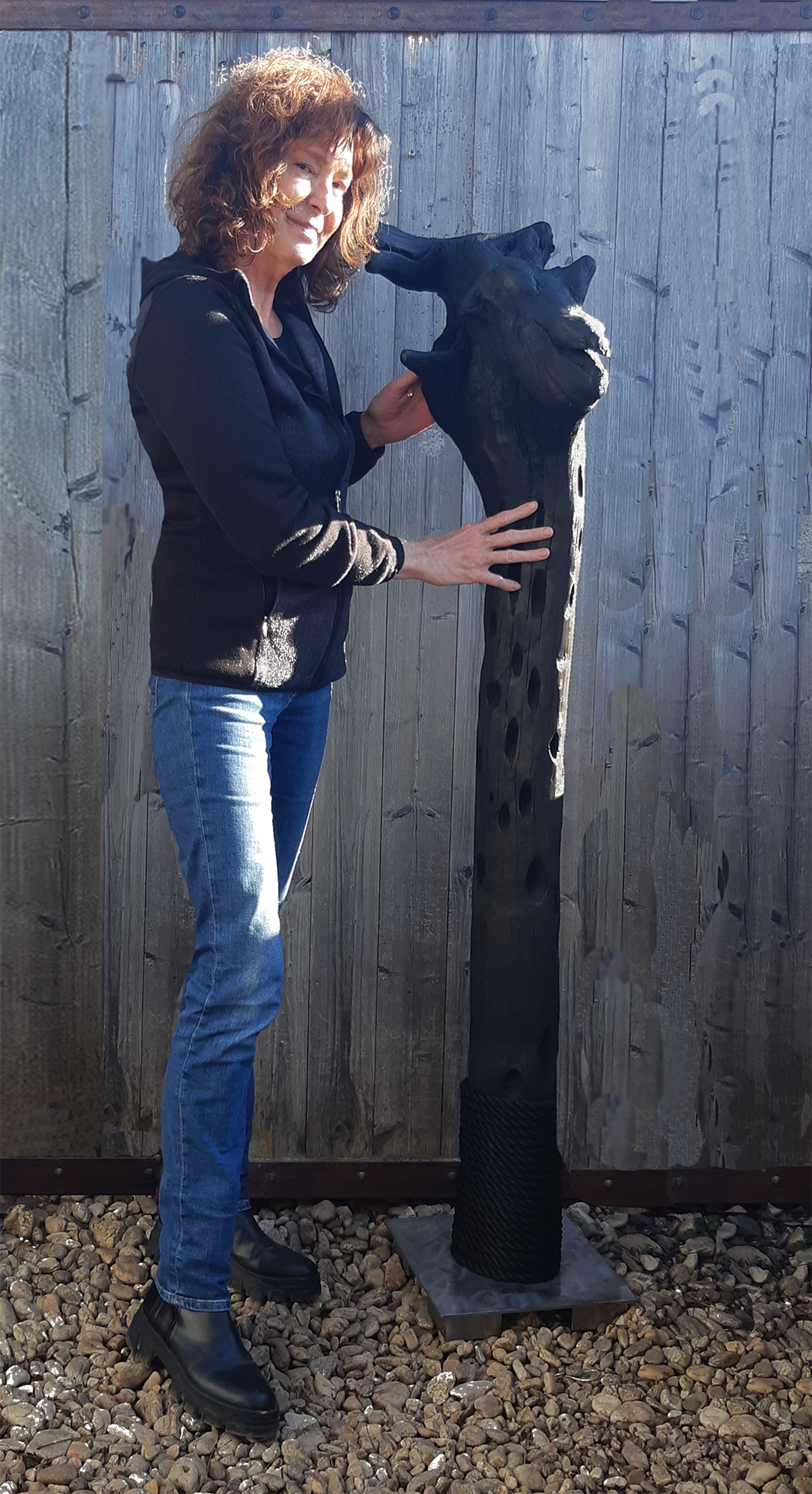 La Girafe. Souche sur son tronc. Patine cire et pigments noir de mars. Hauteur 154cm